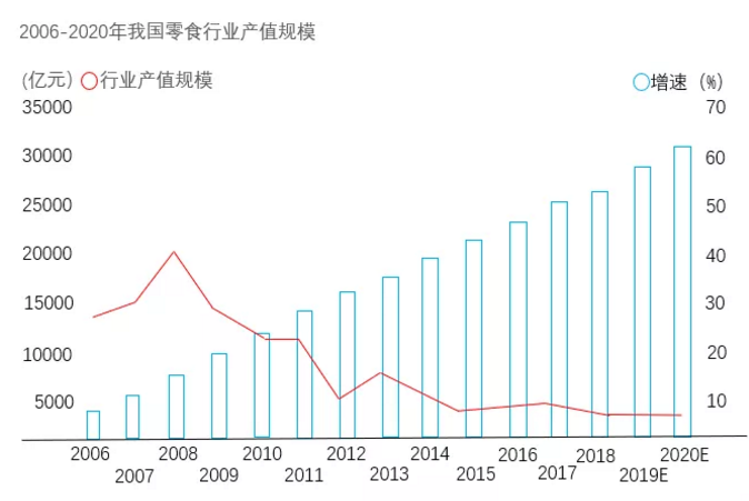 根據(jù)中商產(chǎn)業(yè)研究院《2018中國休閑食品分析報告》,休閑零食市場包含一切“少量方便包裝食品”,2018年市場規(guī)模約18000億元,增速保持在18%—19%左右;中國食品工業(yè)協(xié)會在參考了美國休閑零食定義和人均消費量后,認為我國目前休閑零食銷量已破萬億,并將保持20%以上的復合增速,在2020年將突破2萬億。綜上所述,雖然不同機構數(shù)據(jù)范圍不同,但是從趨勢上面可以看出,休閑食品整體是緩慢回升的態(tài)勢。消費升級、電商的發(fā)展、對休閑食品的消費理念的改變,以及90后消費的崛起帶動了休閑食品的增長。