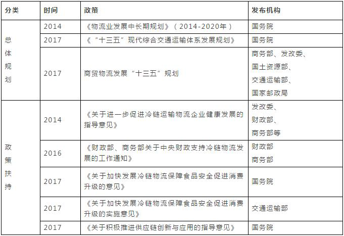 二、我國(guó)冷鏈物流發(fā)展現(xiàn)狀 (一)國(guó)家政策大力支持 近年來(lái),政府層面高度重視冷鏈物流的發(fā)展。僅2017年,國(guó)家層面上先后制定出臺(tái)了《“十三五”現(xiàn)代綜合交通運(yùn)輸體系發(fā)展規(guī)劃》《商貿(mào)物流發(fā)展“十三五”規(guī)劃》《關(guān)于加快發(fā)展冷鏈物流保障食品安全促進(jìn)消費(fèi)升級(jí)的意見》《關(guān)于加快發(fā)展冷鏈物流保障食品安全促進(jìn)消費(fèi)升級(jí)的實(shí)施意見》《關(guān)于積極推進(jìn)供應(yīng)鏈創(chuàng)新與應(yīng)用的指導(dǎo)意見》《關(guān)于提升餐飲業(yè)質(zhì)量安全水平的意見》等文件,推出了農(nóng)產(chǎn)品冷鏈流通標(biāo)準(zhǔn)化示范城市及企業(yè)試點(diǎn)、評(píng)估等活動(dòng),從政策、法規(guī)、行業(yè)標(biāo)準(zhǔn)等角度推動(dòng)了整個(gè)物流行業(yè)轉(zhuǎn)型升級(jí),為冷鏈物流行業(yè)發(fā)展提供了積極的政策環(huán)境。(見表3)