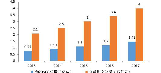 圖2 2013-2017年全國(guó)冷鏈物流總量和冷鏈物流總額增長(zhǎng)變化圖