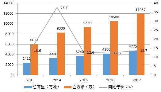 圖3 2013-2017年我國(guó)冷庫(kù)總?cè)萘吭鲩L(zhǎng)變化圖