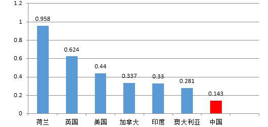 圖10 2016年各國(guó)城市居民人均冷庫(kù)占有量對(duì)比(單位:立方米/人)