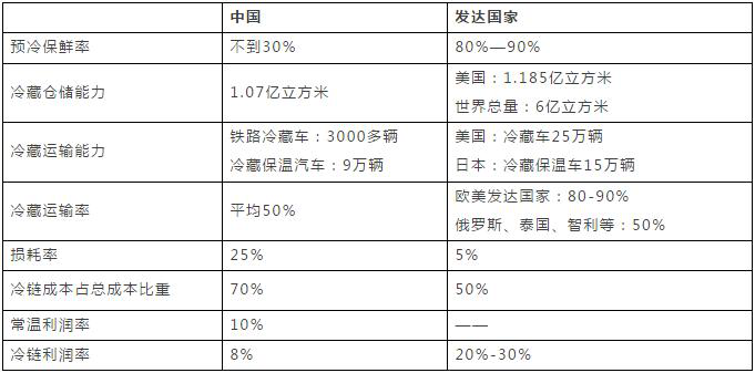 (三)冷鏈物流成本比較 當(dāng)前,我國(guó)每年約有20%—25%的果品和30%的蔬菜在中轉(zhuǎn)運(yùn)輸及存放中腐爛損壞,損壞總量每年高達(dá)上億噸,價(jià)值高達(dá)750億元。相比之下,歐美日等發(fā)達(dá)國(guó)家和地區(qū)實(shí)現(xiàn)了整個(gè)冷鏈管理環(huán)節(jié)的成本控制。(見表5) 表5 我國(guó)與發(fā)達(dá)國(guó)家冷鏈成本