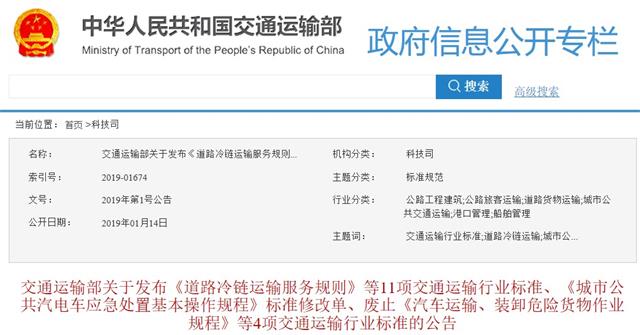 交通部發(fā)布《道路冷鏈運輸服務(wù)規(guī)則》1月14日,經(jīng)過審查,交通部發(fā)布了《道路冷鏈運輸服務(wù)規(guī)則》(簡稱《規(guī)則》)等11項交通運輸行業(yè)標(biāo)準(zhǔn)。