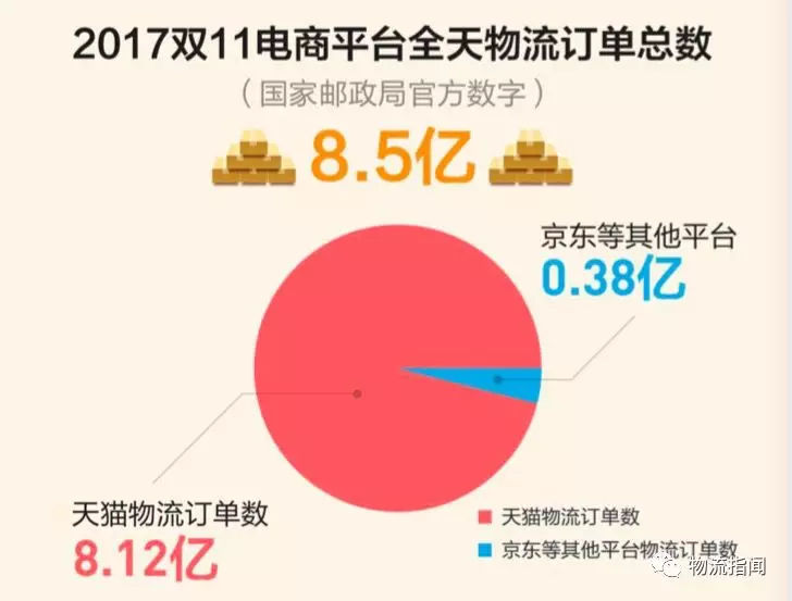 先從我們比較關(guān)心的物流數(shù)據(jù)說起,其中特別具有代表性的就是中國快遞數(shù)據(jù): 2017年全國快遞業(yè)務(wù)量完成400.6億件,是2007年的33.4倍,十年間每年年均增長42%。這一數(shù)量達到日本的10倍,占全球總量的一半。在2017年的400億快遞中68%來自服務(wù)電商,全年收入近5000億元,對全球包裹快遞增長貢獻率超50%。 第三方機構(gòu)根據(jù)阿里2017財年(2016.4-2017.3)年報數(shù)據(jù)推測:2017財年菜鳥網(wǎng)絡(luò)及其物流合作伙伴在零售市場共處理約166億個包裹。同期國內(nèi)快遞行業(yè)業(yè)務(wù)總量為331億個,則菜鳥平臺業(yè)務(wù)量占行業(yè)總比例約為50.15%。所以,菜鳥平臺體量獨占中國快遞的半壁江山。 從2017年雙11的物流數(shù)據(jù)看,菜鳥的物流承載能力已經(jīng)成為了中國電商核心載體。如圖: