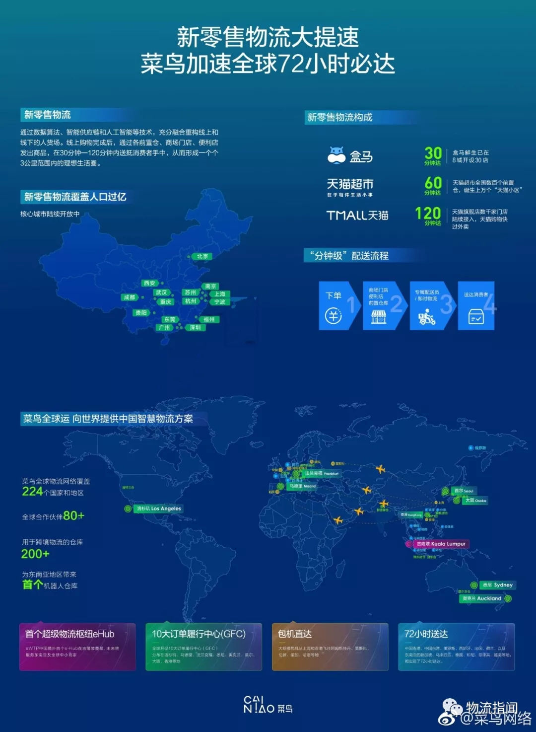 3.菜鳥網(wǎng)絡(luò)的多層網(wǎng)絡(luò)布局: 2017年全面菜鳥的布局來看,已經(jīng)初步實現(xiàn)了圍繞快遞、倉配、國際、末端、農(nóng)村五張物流網(wǎng)絡(luò)建設(shè)。以零售通與菜鳥的合作為例,已經(jīng)實現(xiàn)了物流從大型區(qū)域倉,到城市倉,再到大型商超和萬千小店的快速配送,打通了物流2B和2C模式,重塑了品牌“一盤貨”供應(yīng)鏈,實現(xiàn)了物流驅(qū)動商業(yè)創(chuàng)新。 目前菜鳥的新零售物流已在全國數(shù)十個城市布局,覆蓋近1億人口,真正開辟了新的物流賽道。這個賽道不是單一的快遞、不是單一的城市配送、不是單一的倉儲,也不是單一的最后一公里,是一條新零售的獨特的供應(yīng)鏈通路。