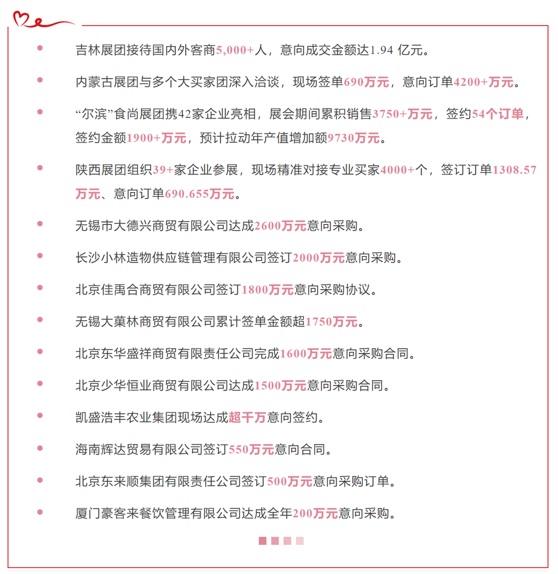 從百千萬(wàn)“小單”到億級(jí)大單,現(xiàn)場(chǎng)爆單不能停 展會(huì)現(xiàn)場(chǎng),人潮涌動(dòng),各個(gè)展位都圍滿(mǎn)了專(zhuān)業(yè)觀眾,他們或試吃試飲親身感受產(chǎn)品特色,或詳細(xì)咨詢(xún)產(chǎn)品信息及合作意向。各個(gè)商貿(mào)洽談區(qū)更是人氣火爆,現(xiàn)場(chǎng)達(dá)成了多項(xiàng)國(guó)內(nèi)外商貿(mào)合作,海內(nèi)外展商與買(mǎi)家均收獲超出預(yù)期的商貿(mào)成果: