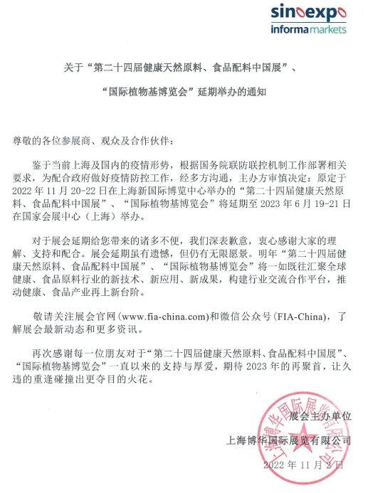 關(guān)于“第二十四屆健康天然原料、食品配料中國展”、“國際植物基博覽會”延期舉辦的通知