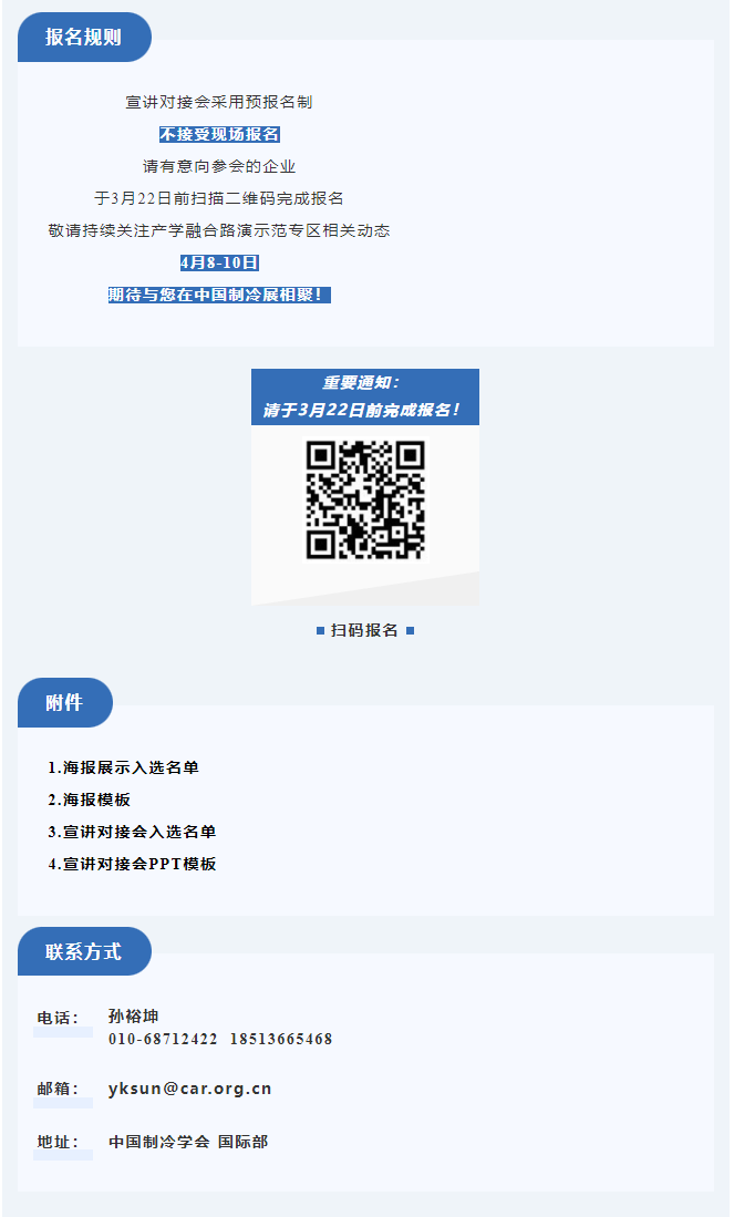 路演專區(qū)由中國(guó)制冷展組委會(huì)主辦,中國(guó)制冷學(xué)會(huì)承辦,中國(guó)制冷學(xué)會(huì)產(chǎn)學(xué)融合工作委員會(huì)協(xié)辦,位于北京·中國(guó)國(guó)際展覽中心(順義館)E1館E1D43展位,占地700余平米,設(shè)“科技成果轉(zhuǎn)化優(yōu)秀案例”和“技術(shù)路演”2大板塊。