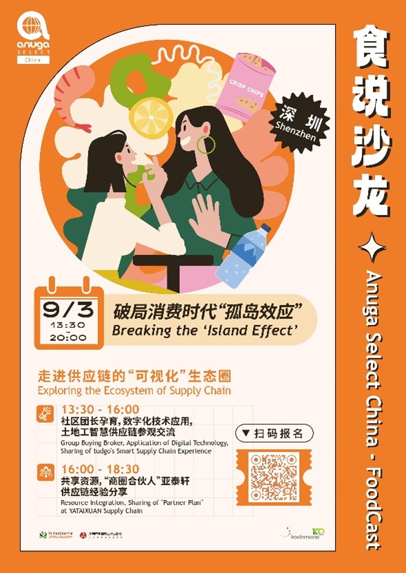 9月3日深圳線下活動(dòng)——Anuga Select China-FoodCast食說沙龍 為了更好地滿足展商與買家的商貿(mào)對(duì)接需求,Anuga Select China世界食品(深圳)博覽會(huì)一直持續(xù)地舉辦線下商貿(mào)活動(dòng)——“Anuga Select China-FoodCast食說沙龍“,助力食飲企業(yè)與品牌及時(shí)獲取最新行業(yè)前沿趨勢(shì),挖掘華南與大灣區(qū)最新市場(chǎng)先機(jī)。